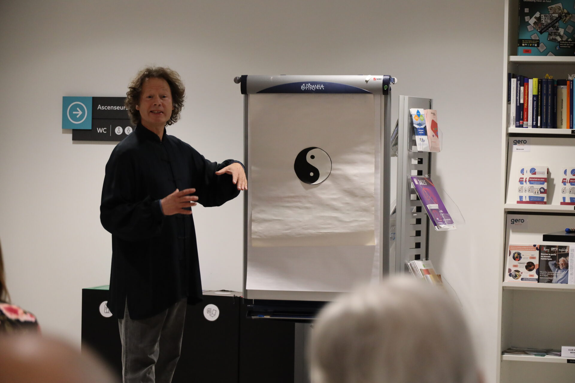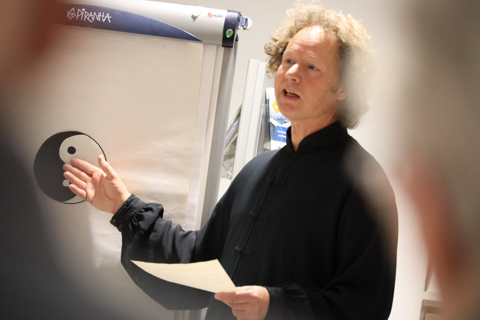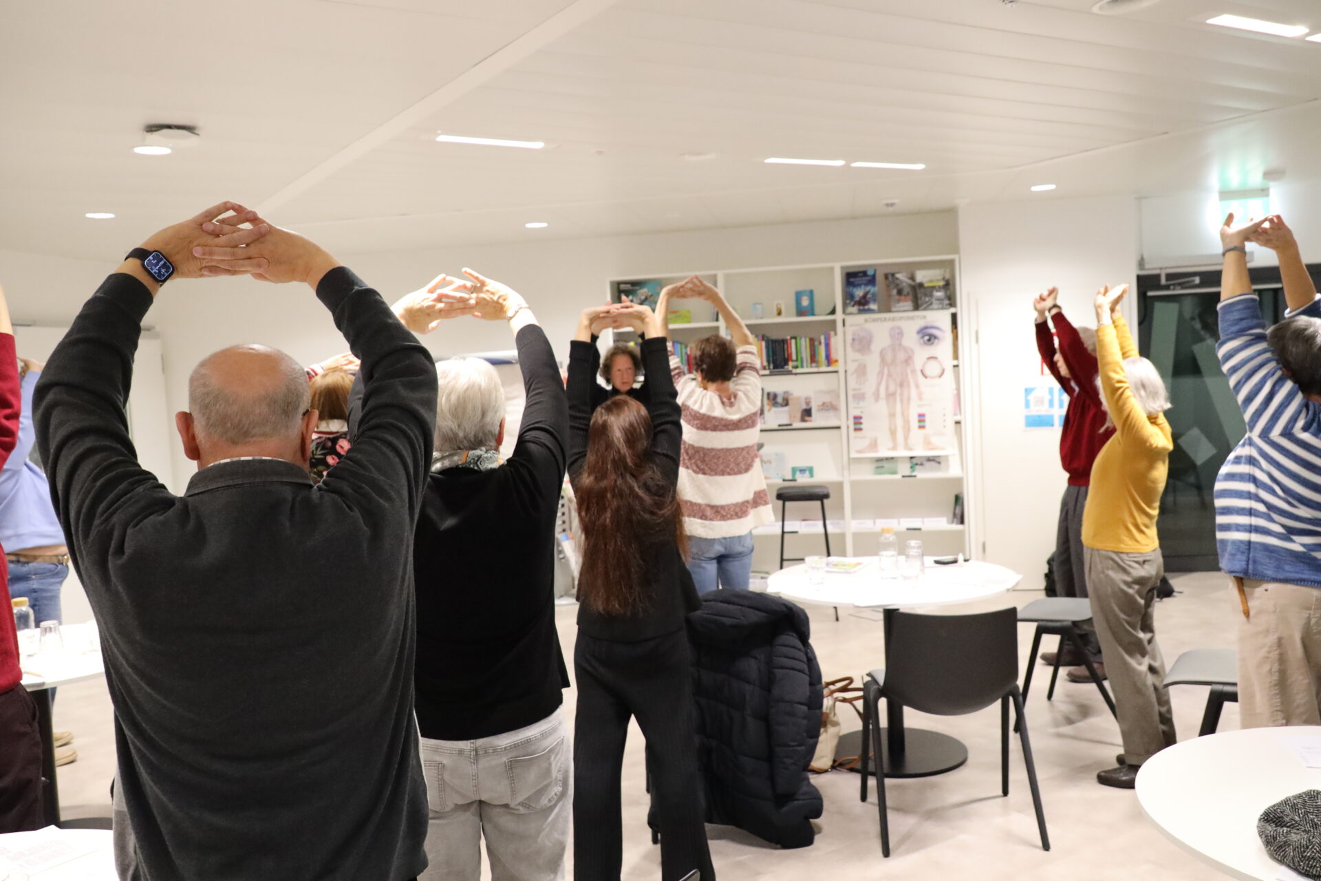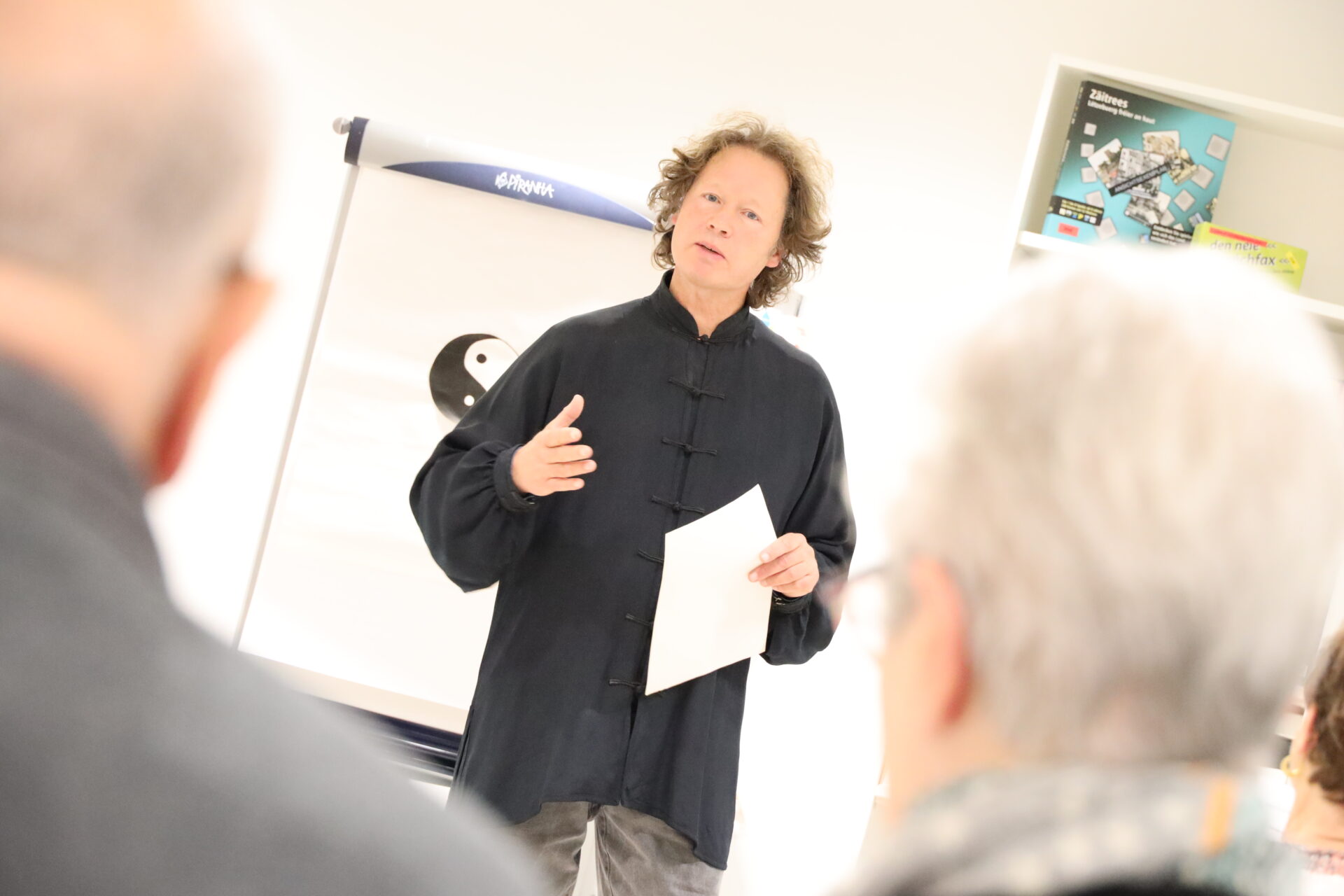 Qi Gong, wörtlich übersetzt Atemübung, zielt auf eine verbesserte Körperwahrnehmung sowie Atmung ab und beinhaltet gleichzeitig Haltungsschule sowie Konzentrations- und Entspannungstechniken. Der Begriff Qi bedeutet ebenfalls „Lebensenergie“, welche im Idealfall im Menschen ungestört fließt und somit eine effiziente Verteilung der Vitalkraft ermöglicht. Unter Leitung von Christian Colombo, u.a. Lehrer für Qi Gong und Tai Chi, werden im Wechsel zwischen sitzender und stehender Position Übungen mit leichten Bewegungselementen zur gezielten Dehnung und Kräftigung des Körpers ausgeführt.
